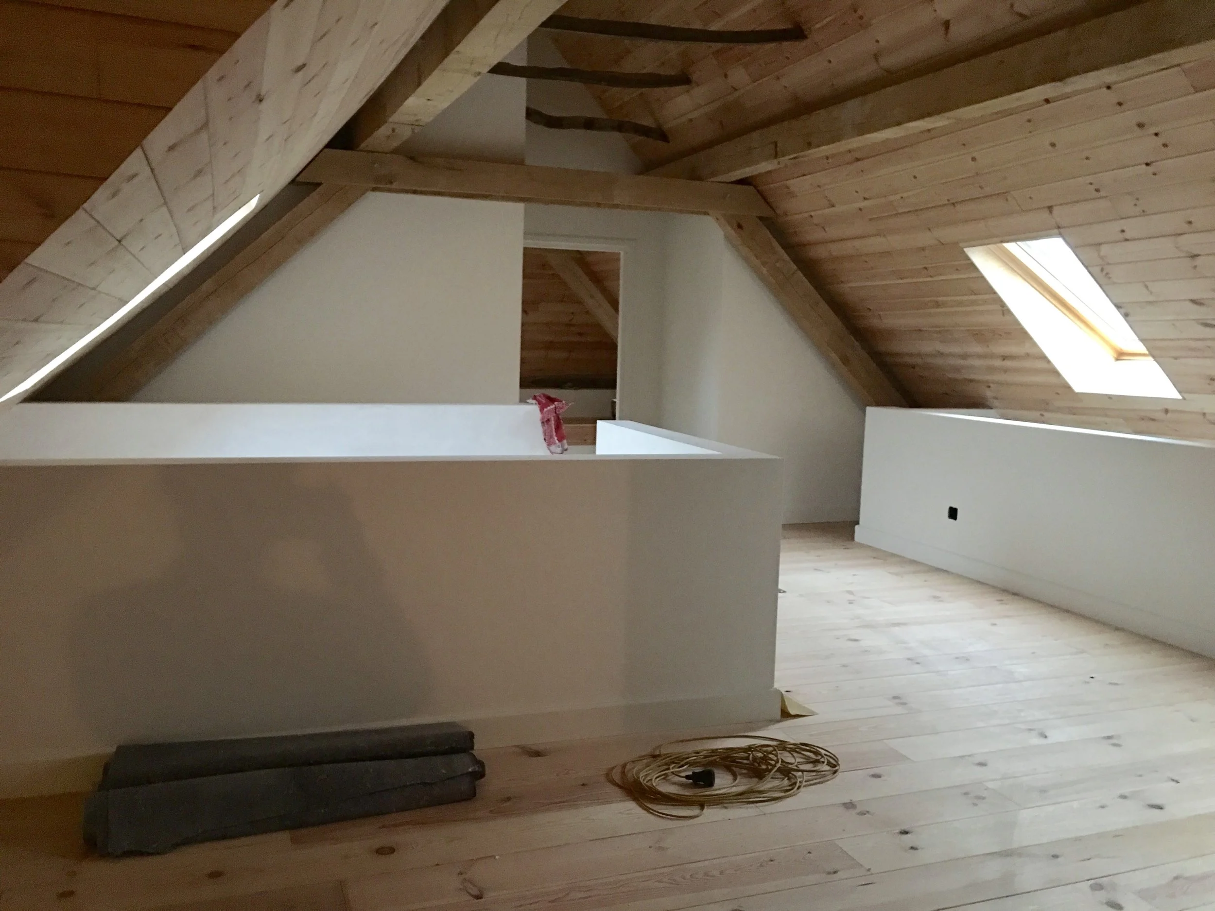 When the walls were finished downstairs, it was time to do some little brickwalls upstairs and then all brick wall constructions were ready and we could start with isolating and finishing the roof upstairs. A lot of work, with real precision, because the old roof was definitely not straight and had a lot of flow. The new oak beam construction was placed to give the roof some extra support.
