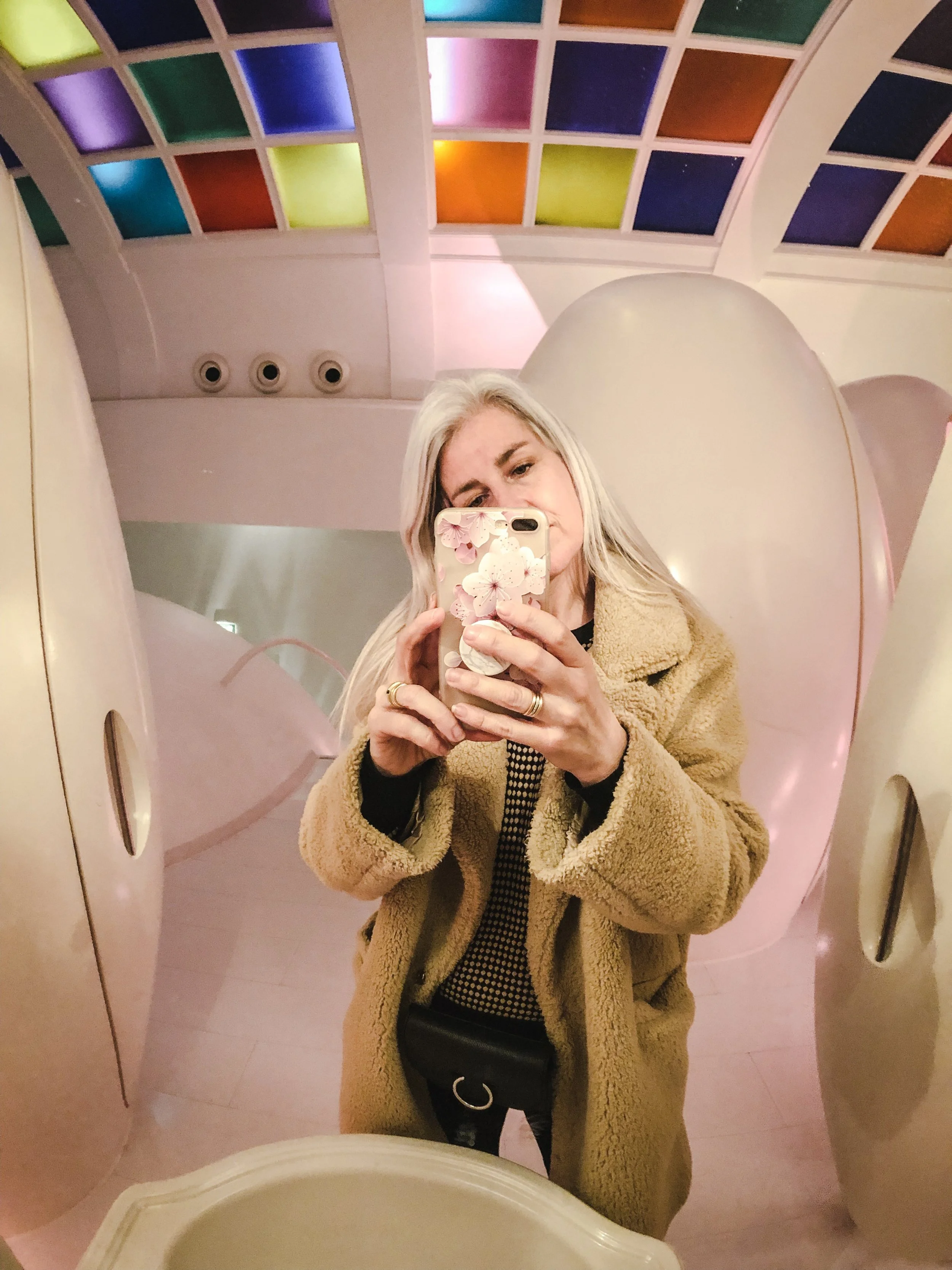 After some shopping at Oxford street we decided to have a dessert at Sketch. Also seen on Insta, this pink restaurant with the beautiful mosaic floor was on my wishlist. No idea, if we were allowed to visit (since it was quite late and ginger was only 14) we walked over there. The man at the entree allowed us to enter for a dessert, I think he thought it was quite funny. It is a very extraordinary place, the entree is already amazing and the pink restaurant feels very elegant. Pink walls, pink velvet chairs and a beautiful mosaic floor. The ceiling has a big round glass window. The walls are decorated with sketches. We had a seat at the bar and ordered two desserts, they looked like art, tasted like heaven. Ginger thought it was quite an experience. Especially the bathrooms, they are extraordinarily. White stairs leading up to a colourfull glass ceiling, where egg shaped bubbles are the toilets....you just have to visit this place once...