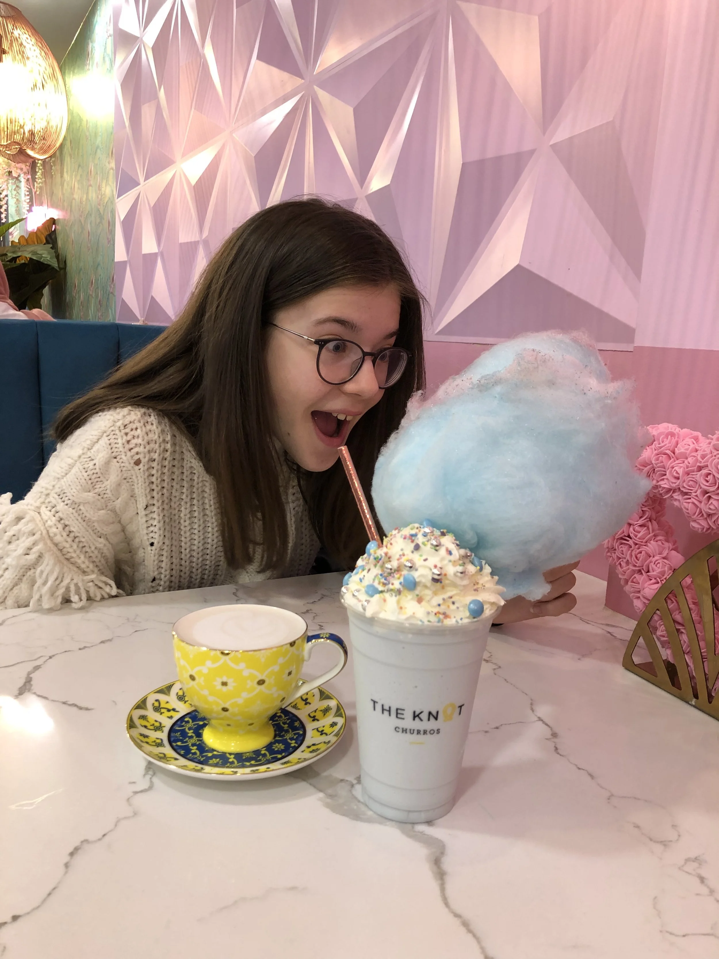 After our visit at Harrods we went to the Knot Churros in South Kensington. A colourfull cafe where Ginger decided to take an enormous blue coloured Freakshake topped with candycane floss and for me a cappucino, to balance it out... The cafe was quite busy and we had to wait 20 minutes before we could have a table. But the neighbourhood is nice to walk around while waiting.